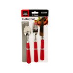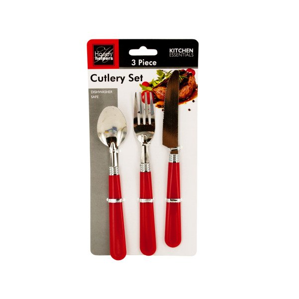 This cutlery set is ideal for dorms, camping or picnics. Includes 1 spoon, knife and fork. Cutlery is made of metal with a plastic handle. Comes packaged on a tie card with hanging hole.