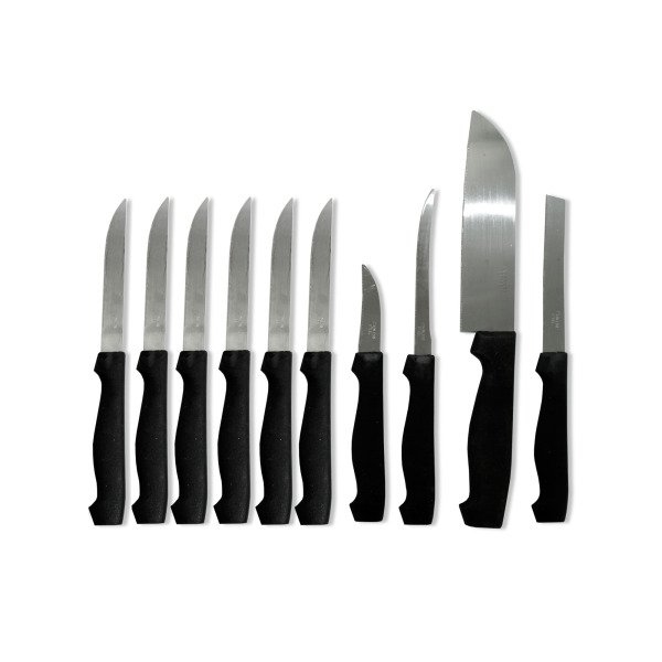 The deluxe knife set comes with every knife a kitchen needs to whip up delicious and professional meals. Includes: 6 steak knives, 1 paring knife, 1 chef knife, 1 fillet knife and 1 bread knife. Set is packaged inside an individual box.
