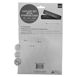 Enjoy meals on the go with this convenient BPA-free cutlery set, featuring a fork, knife, spoon, and a compact storage case. Designed for portability, this green-colored set is perfect for travel, camping, picnics, or everyday use. The sturdy and durable set is reusable, helping to reduce waste from disposable cutlery. The storage case keeps the fork, knife, and spoon clean and organized, making it easy to carry in bags or lunchboxes. Ideal for eco-conscious consumers looking for a sustainable and stylish dining solution. Comes packaged with a hanging tie card. The Package measures approximately 6.5" x 11". ,Portable Cutlery Set with Storage Case,